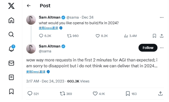 這條帖子是 12 月 24 日凌晨 3:15 分發(fā)出的,結果兩分鐘之后,阿爾特曼好像被“嚇到了”,又發(fā)了一條推文:“哇,前兩分鐘之內許愿通用人工智能(AGI)的呼聲比我預期的多多了。很抱歉讓大家失望了,我認為我們明年還無(wú)法達成這一目標……”