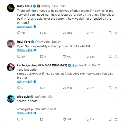 在評論區中,還有多條熱評提出了不同的想法,比如希望能夠新增成人模式、提升開(kāi)源的優(yōu)先級、在聊天中加入搜索功能等。