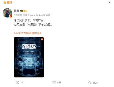 小米汽車(chē)技術(shù)發(fā)布會(huì )官宣定檔 12 月 28 日:雷軍稱(chēng)“這次不發(fā)產(chǎn)品”