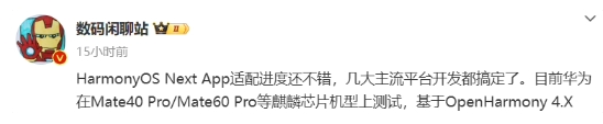 據博主 @數碼閑聊站 今日爆料,華為 HarmonyOS Next App 適配進(jìn)度良好,幾大主流平臺開(kāi)發(fā)都搞定了。目前華為在 Mate40 Pro / Mate60 Pro 等麒麟芯片機型上測試,基于 OpenHarmony 4.X 打造。
