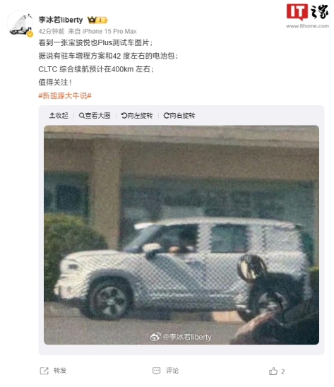 該博主爆料稱(chēng),新車(chē)有望提供駐車(chē)增程方案和 42 度左右的電池包,CLTC 工況綜合續航預計為 400km 左右。