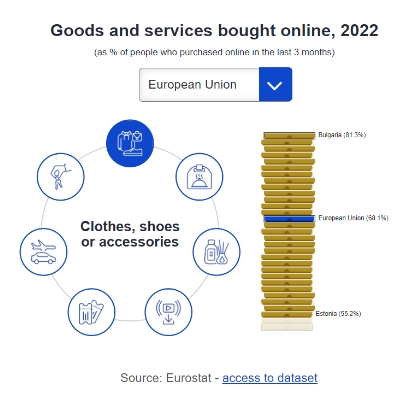 2022年,在網(wǎng)購的人群中有68%購買(mǎi)了衣服、鞋子或配飾。