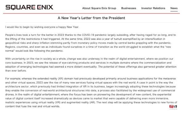 Square Enix 新任社長(cháng)桐生隆司日前發(fā)布了 2024 年總裁新年信,概述了公司今年的主要戰略方向,其中主要提到“三大重點(diǎn)”,即“改善游戲質(zhì)量”、“強化發(fā)行能力”、“引入 AI 等新技術(shù)”。