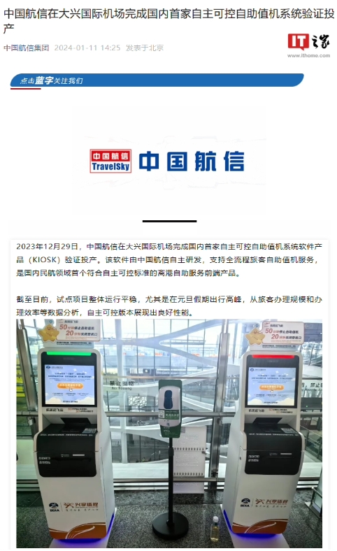 中國航信集團宣布,2023 年 12 月 29 日,中國航信在大興國際機場(chǎng)完成國內首家自主可控自助值機系統軟件產(chǎn)品(KIOSK)驗證投產(chǎn)。