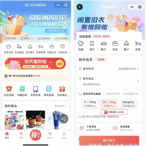 通過(guò)小程序可以填寫(xiě)個(gè)人信息以及上門(mén)回收時(shí)間,平臺會(huì )根據預約時(shí)間安排回收員免費上門(mén)回收舊衣物。