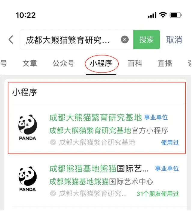 打開(kāi)官方小程序有以下兩種方式:點(diǎn)開(kāi)微信右上角的“掃一掃”,掃碼小程序二維碼進(jìn)入;點(diǎn)開(kāi)微信主頁(yè)上方的“搜索”,輸入“成都大熊貓繁育研究基地”“熊貓基地”選擇小程序進(jìn)入。