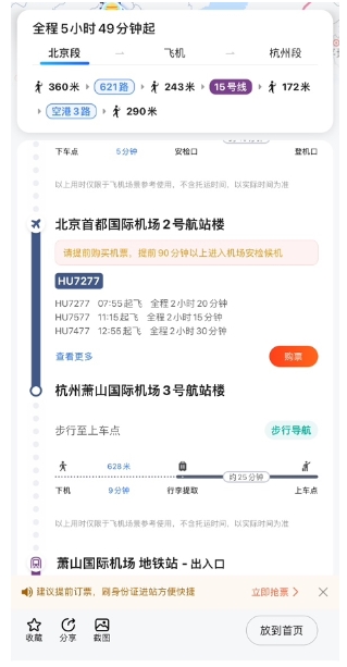 針對選擇公共出行的用戶(hù),高德提供的“門(mén)到門(mén)”跨城公交服務(wù)包含公交、地鐵、火車(chē)、飛機、步行、打車(chē)等多種出行方式,不僅可以根據時(shí)長(cháng)、費用、換乘情況、步行距離等多重要素,進(jìn)行路線(xiàn)的智能化推薦、一鍵購票,還能將用戶(hù)站內換乘距離和時(shí)長(cháng)、建議出發(fā)時(shí)間等細節均考慮在內。