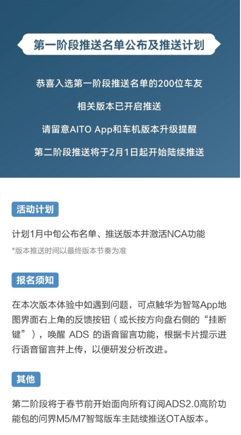 昨晚,官方公布了“第一階段推送名單及推送計劃”,據稱(chēng),第一階段推送的200位車(chē)友相關(guān)版本已經(jīng)開(kāi)啟推送,第二階段推搡將于今日起開(kāi)始陸續推送。
