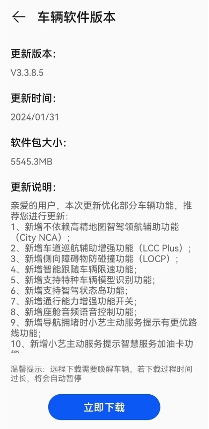 跟根據推送的更新包來(lái)看,最新版的NCA高階智駕為V3.3.8.9,更新時(shí)間為1月30日,軟件包大小為2個(gè)多G,在更新說(shuō)明中可以看到具體以下幾個(gè)方面: