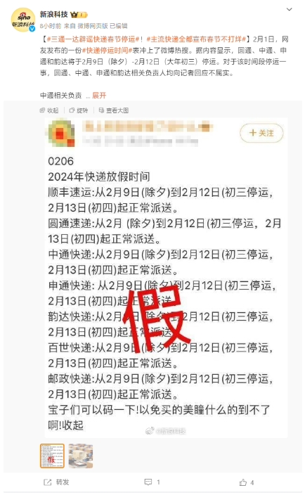 三通一達春節停運?多家快遞公司稱(chēng)“消息不屬實(shí)”,春節不打烊