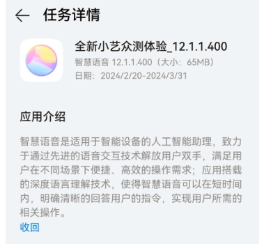 華為 P50 Pro 手機現已開(kāi)啟小藝大模型版眾測,版本號為 12.1.1.400,大小為 65MB,日期為 2024/2/20-2024/3/31。