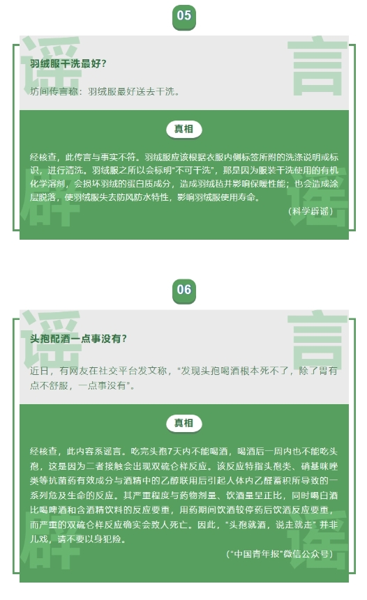 針對“頭孢配酒一點(diǎn)事沒(méi)有”,經(jīng)“中國青年報”微信公眾號核查,此內容系謠言。吃完頭孢 7 天內不能喝酒,喝酒后一周內也不能吃頭孢,這是因為二者接觸會(huì )出現雙硫侖樣反應。該反應特指頭孢類(lèi)、硝基咪唑類(lèi)等抗菌藥有效成分與酒精中的乙醇聯(lián)用后引起人體內乙醛蓄積所導致的一系列危及生命的反應。其嚴重程度與藥物劑量、飲酒量呈正比,同時(shí)喝白酒比喝啤酒和含酒精飲料的反應要重,用藥期間飲酒較停藥后飲酒反應要重,而嚴重的雙硫侖樣反應確實(shí)會(huì )致人死亡。因此,“頭孢就酒,說(shuō)走就走” 并非兒戲,請不要以身犯險。