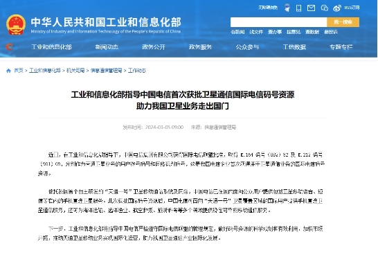 工信部指導中國電信首次獲批衛星通信國際電信碼號資源