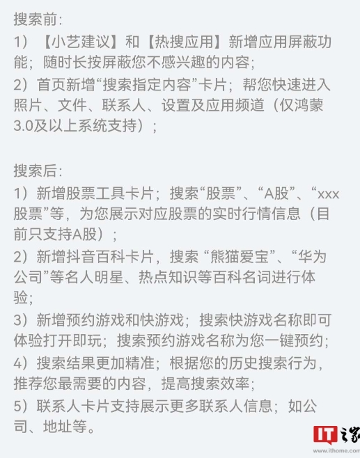華為“智慧搜索”應用近日獲推 16.0.0.200 版本眾測更新,該版本包體積為 29.9 MB,主要新增“屏蔽不感興趣內容”、“搜索指定內容”、“股票工具卡片”等內容。
