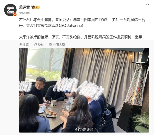 據差評君獲得的照片,網(wǎng)易 CEO 丁磊和暴雪新 CEO Johanna Faries 會(huì )面。該博主還表示“暴雪回歸本周內官宣”。