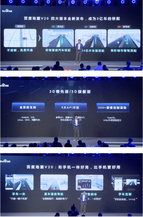 百度 Apollo 汽車(chē)智能化產(chǎn)品發(fā)布會(huì )上,百度地圖 V20 版本對外亮相,共推出四大版本: