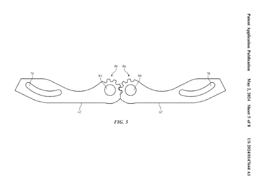 圖 5 中展示了齒輪狀的鉸鏈設計,齒輪板具有容納軸 #82 的開(kāi)口 #84,以便齒輪板可以繞軸旋轉。外殼 (#12) 的一半繞軸 #28 旋轉時(shí),板的配合齒使外殼的另一半同步旋轉。