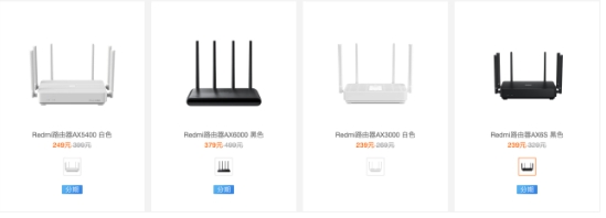 目前小米官網(wǎng)在售的 Redmi 路由器有 5 款,均為 Wi-Fi6 路由器,分別是 Redmi 路由器 AX5400、Redmi 路由器 AX6000、Redmi 路由器 AX3000、Redmi 路由器 AX6S 和 Redmi 電競路由器 AX5400,售價(jià)從 239 元到 459 元不等。