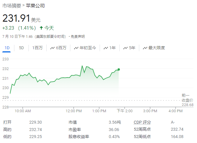 此消息公布后,蘋(píng)果股價(jià)一度上漲1.8%至232.74美元,刷新盤(pán)中新高。截至周二收盤(pán),該股今年已累漲19%。