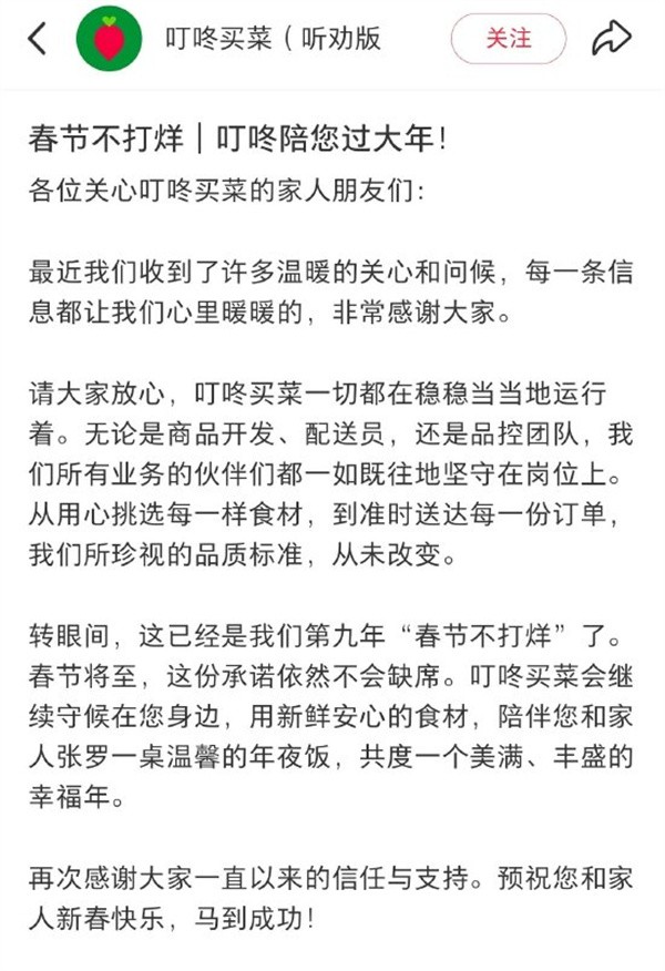 對此,叮咚買(mǎi)菜回應稱(chēng):目前叮咚買(mǎi)菜業(yè)務(wù)及團隊均在正常、穩定運行中,將一如既往地為大家提供高質(zhì)量的商品和服務(wù)。此外,官方還表示,今年叮咚買(mǎi)菜將實(shí)行第九年春節不打烊,各業(yè)務(wù)團隊將全方位保障用戶(hù)的春節消費體驗。