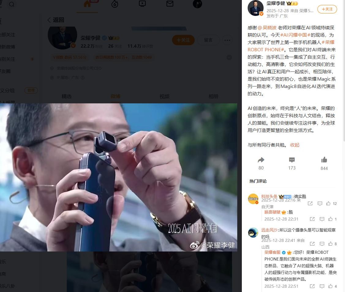 榮耀終端股份有限公司 CEO 李健去年 12 月分享稱(chēng),吳曉波在 AI 閃耀中國的現場(chǎng),展示了世界上第一款手機機器人—— 榮耀 ROBOT PHONE。據介紹,該機集成了自主交互、行動(dòng)能力和高清影像。