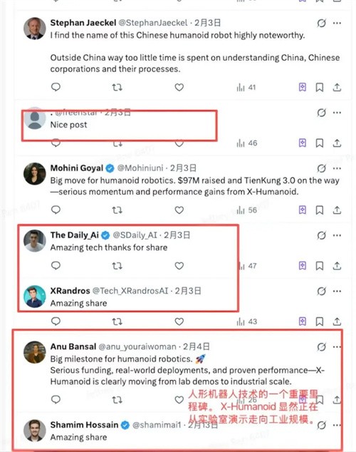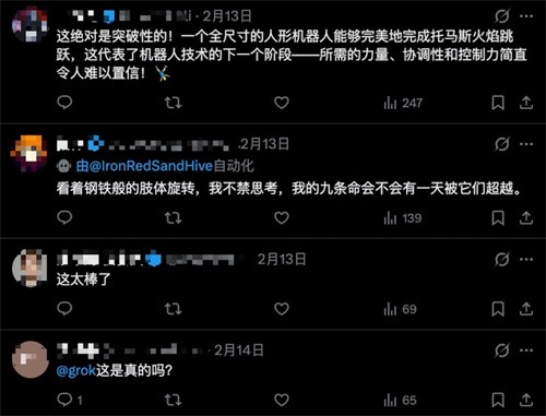 在海外社交媒體平臺X上,多位科技與機器人領(lǐng)域KOL轉發(fā)相關(guān)視頻,評論區持續刷出“That’s amazing(令人驚嘆)”“Nice Post(好的發(fā)布)”“Is this real?(這是真的嗎?)”等反饋。