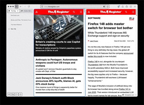 3 月 3 日消息,據科技媒體 The Register 昨天報道,火狐 Firefox 瀏覽器 149 Beta 版現已新增分欄瀏覽功能,能夠讓用戶(hù)在同一個(gè)窗口中并排瀏覽兩個(gè)網(wǎng)頁(yè),還能使用鼠標調整兩者之間的比例,正式版有望 3 月 24 日發(fā)布。